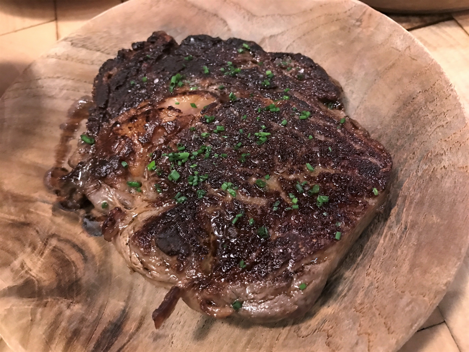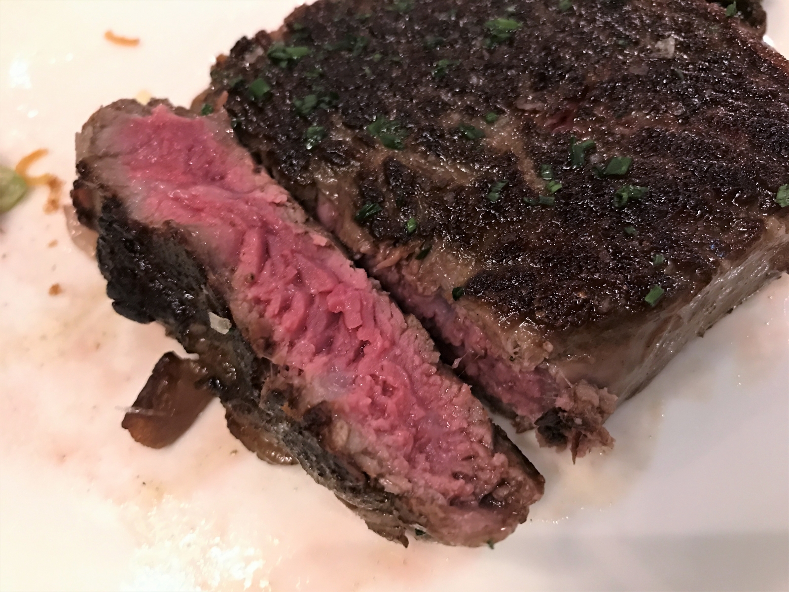 老婆點了牛肩扒,切開一看,嫩紅亮麗,是標準的medium rare。