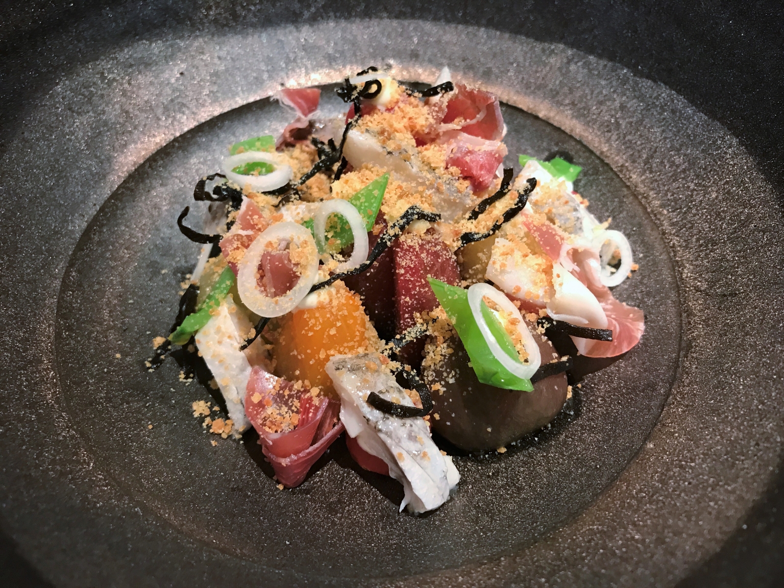 用上九州產的五色番茄,甜美多汁;還有西班牙橡木果風乾火腿和醋漬日本梭子魚,鹹香與微酸交疊,味道配合得恰到好處,精彩!