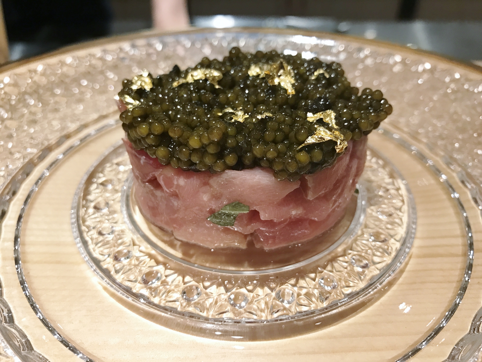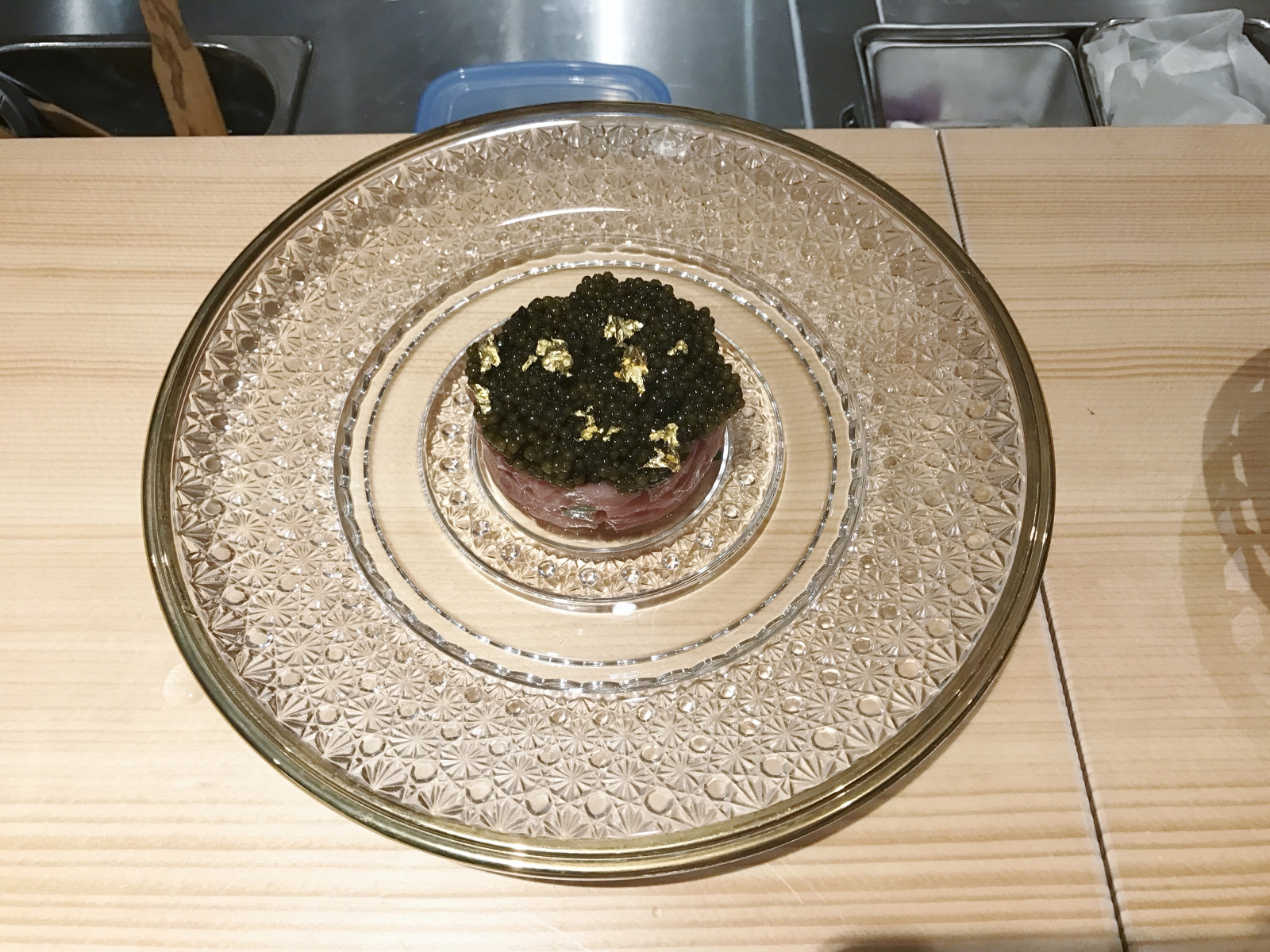 以精美的水晶餐碟盛載,上面鋪滿魚子醬,還以金箔點綴,瑰麗奢華!