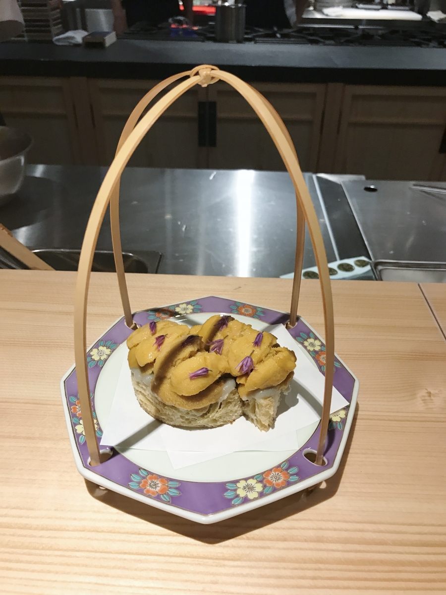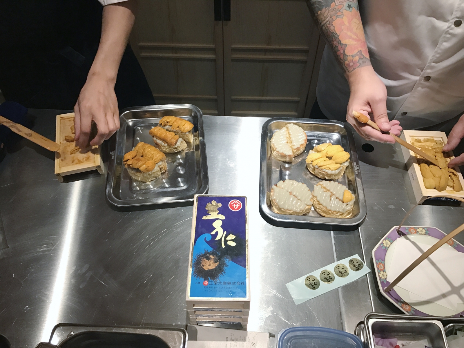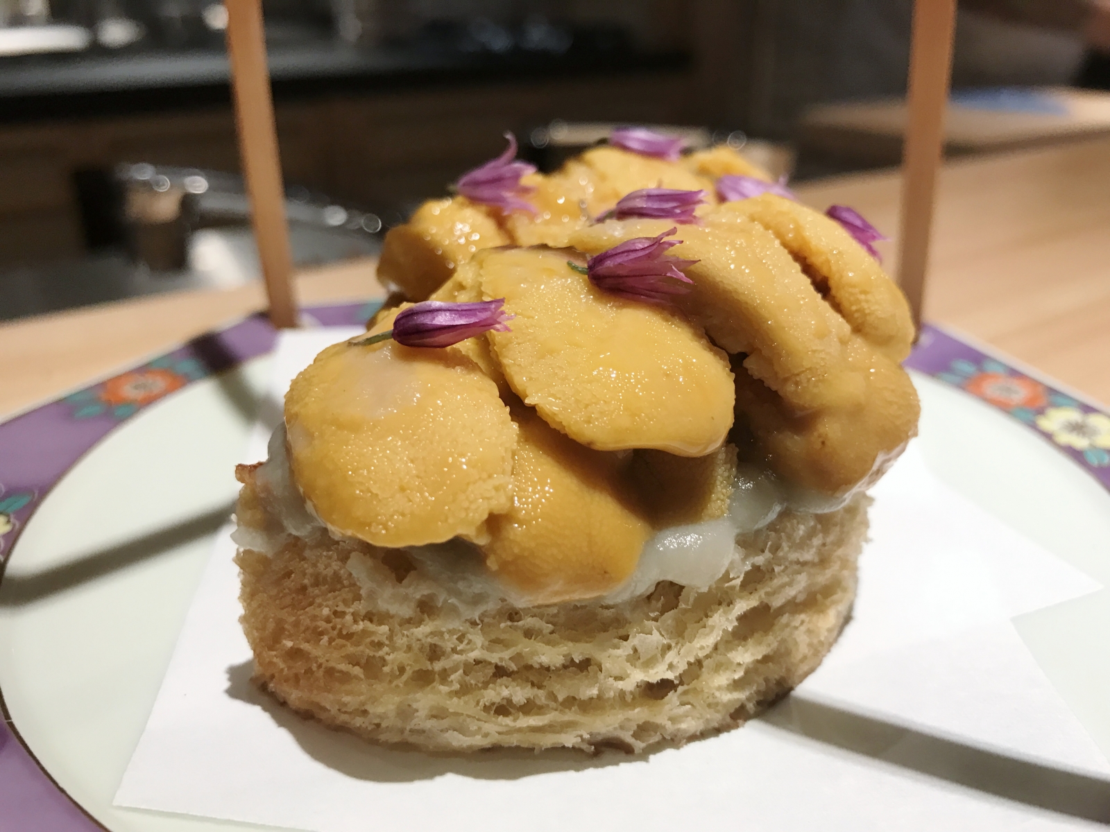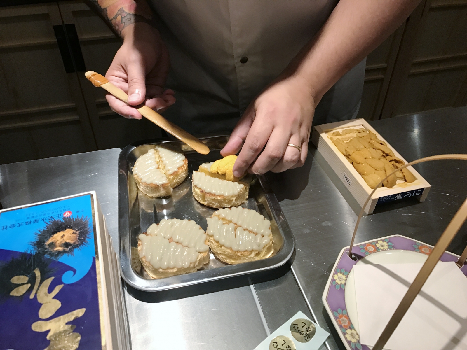 看着大廚把海膽一大排一大排的鋪在麪包上,豈能不心動?
