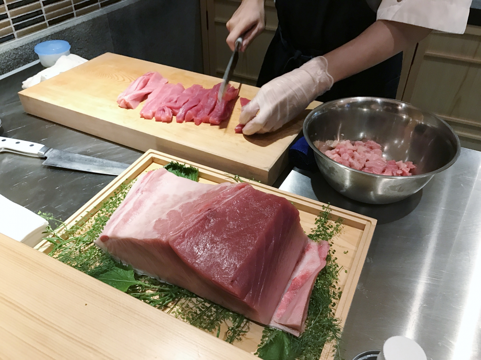 大廚這時拿出一大件吞拿魚,看見魚肉顏色由深紅漸變粉紅,是漂亮的中拖羅。