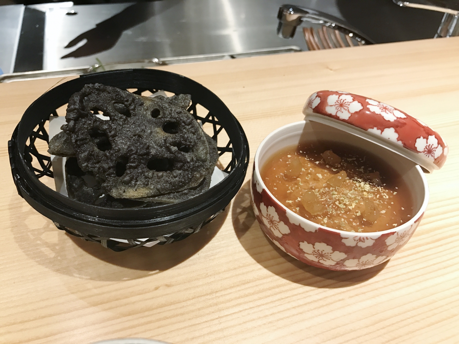 蓮藕薄切,沾上墨魚汁脆漿炸脆;