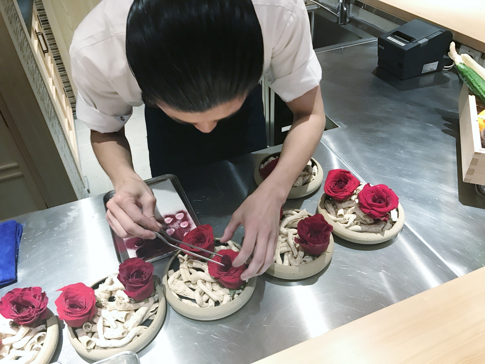 大廚把紅菜頭切成薄片,再捲成花蕾,非常精緻!