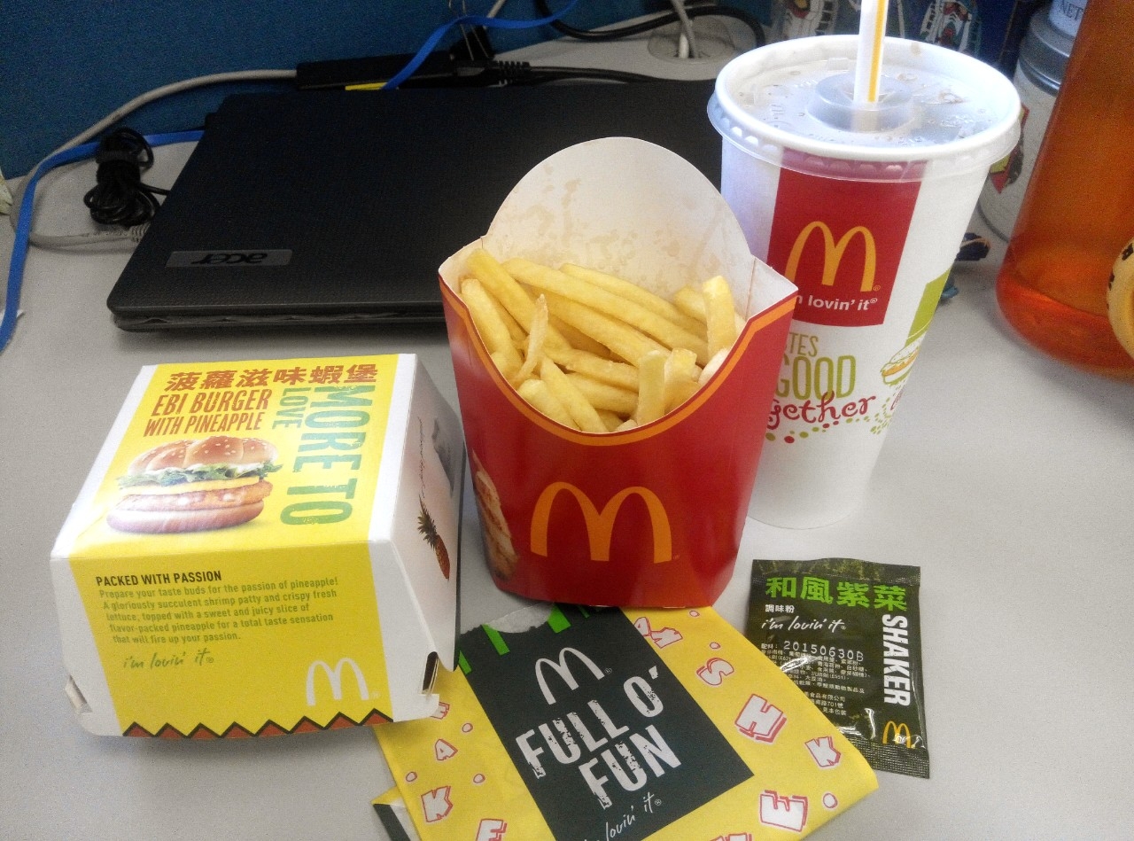 24-04-2015 一般情況下也不會選擇麥當勞的,奈何今晚要留在公司加班,行遍公司附近的商場和大街小巷,也找不到合心意的食肆。剛好有三張麥記現金券,便試試新推出的菠蘿蝦堡吧! 點加大套餐便有shake shake薯條。 「走樣」是常識吧!但不算太離譜,合格! 炸蝦外層鬆脆,蝦肉也算爽口。菠蘿鮮甜多汁,與炸蝦很「合拍」! 做點運動! ... 看全文 -