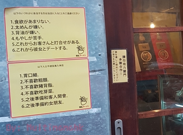這間舖面標示著幾項特別的溫馨提示: 但我偏偏係今日同外子約會,仲要之去工作既時候,就去光顧這間拉麵店。 入到去係一般日式拉麵屋間格,每一個麵就剔1張ORDER 紙。我今次試下混乱玉子拉麵,所有配料正常份量,不過有個選項我很好奇,究竟咩係「背脂先生」? 係等待期間周圍望,調味料有醋及醬油,以及張貼份量比例的的圖片。 拉麵黎到,有配料,叉燒及玉子。湯味濃郁,而且拉麵爽口,喜歡酸味的我更加了香醋調味,所以一迅間我已清除了半碗拉... 看全文 -