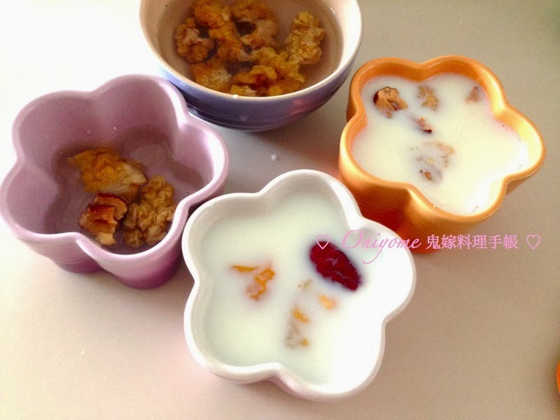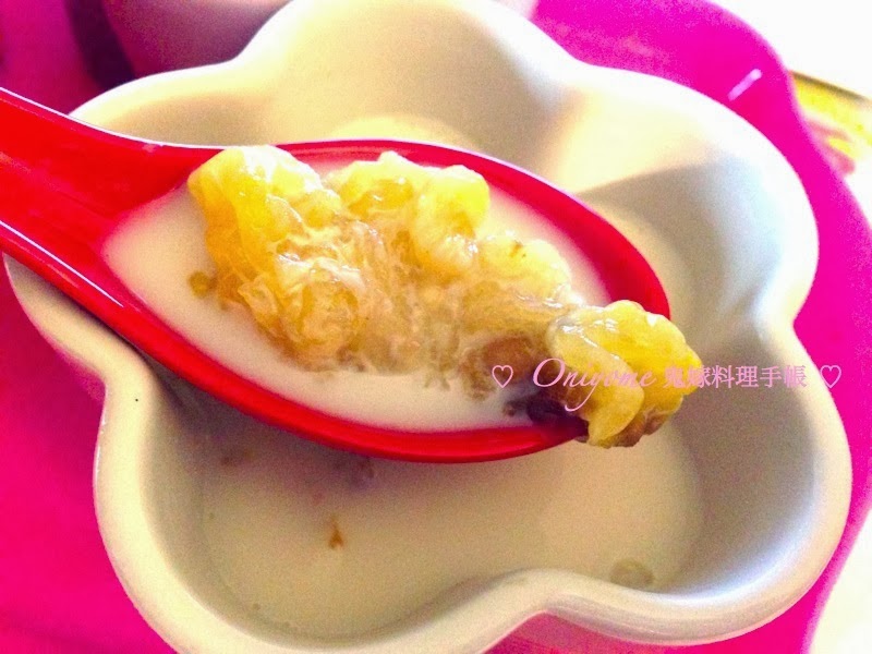 今次分了3小盅來燉,做個小實驗,1盅加水先燉1.5小時,再加奶燉半小時,第2盅全部用奶,第3盅用1/3水和2/3奶,都是燉2小時,結果是第3盅口感較好,感覺滿口是膠,用水先燉再加奶那盅口感較差,好像膠質被沖掉,只嚐到奶的味道,用全奶的也好味,但全奶有可能會結塊,所以加水較穩陣。燉了1小時後,拿出來試味,黃耳已能吃,口感較爽,膠質不濃,愛清爽口味的可燉短一點時間。因為牛奶加熱需時,燉的時間不能太短。