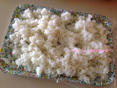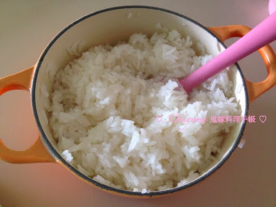 3) 小碗混和米醋和糖,糖不須完全溶掉,白飯比平時少一點水去煮,煮好後,趁熱加入拌好的醋糖,拌勻,可試味再隨口味加入醋或糖