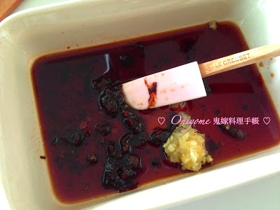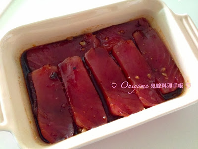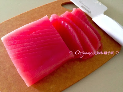 2)深盤混和所有調味料,加入吞拿魚片,讓醬汁蓋過所有魚片,以包鮮紙包好,入雪櫃放1小時