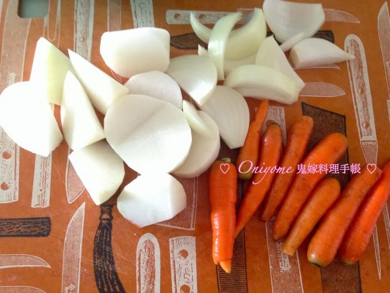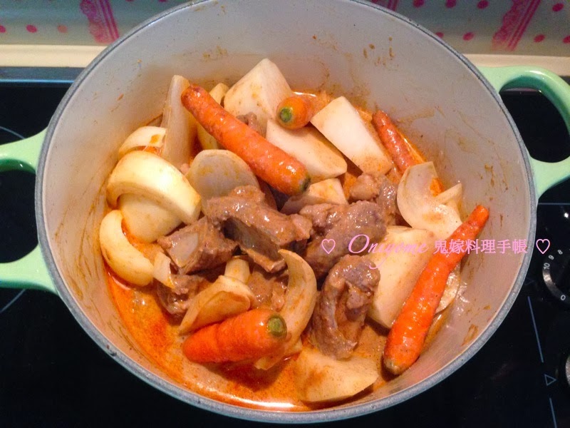 6) 下洋蔥、甘荀、 白蘿蔔炒勻,滾起加蓋轉小火煮30分鐘,熄火焗30分鐘,再開火滾起加蓋轉小火煮30分鐘, 熄火焗30分鐘