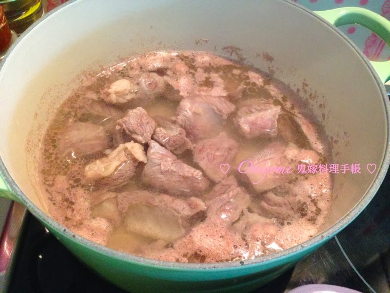 2) 凍水落牛肋條,中火燒至微滾,熄火,以凍水沖洗牛肋條(此為跑活水)