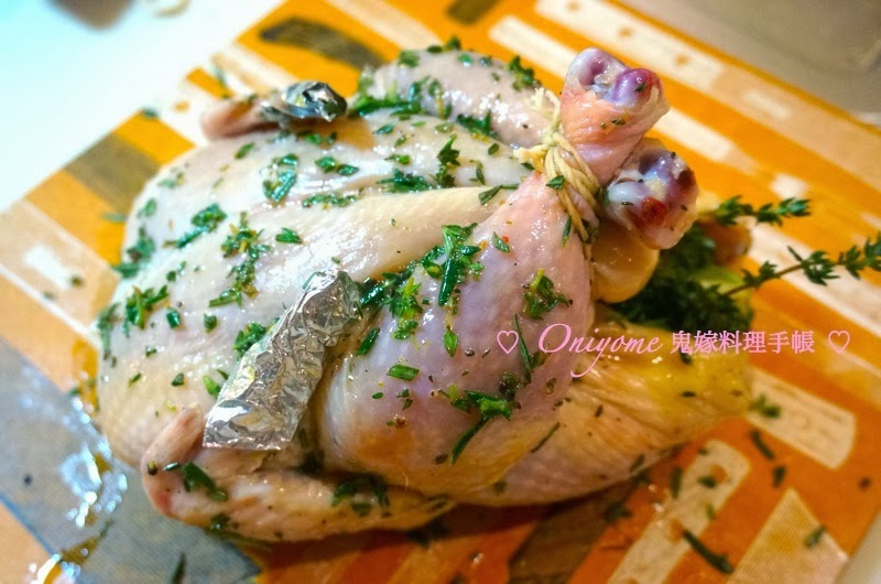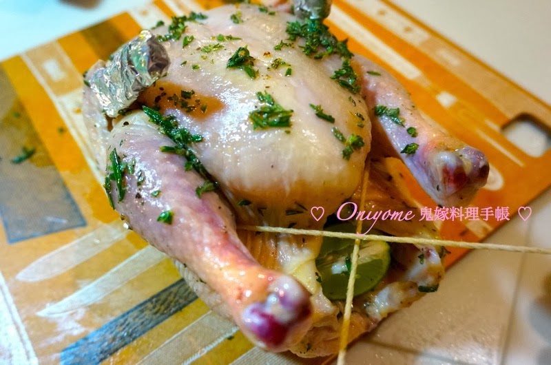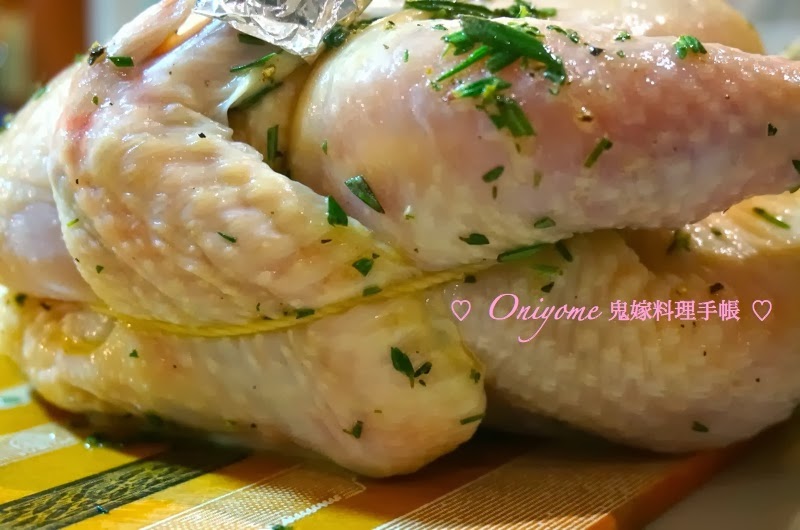 今次用了新方法來燒雞,就是把雞縛好才去烤, 特別是大雞,縛著來烤,不但讓雞肉能平均受熱,雞胸肉也較嫩滑,雞的型狀也能保持美美的,原隻上碟更好看,縛雞有幾種方法,
