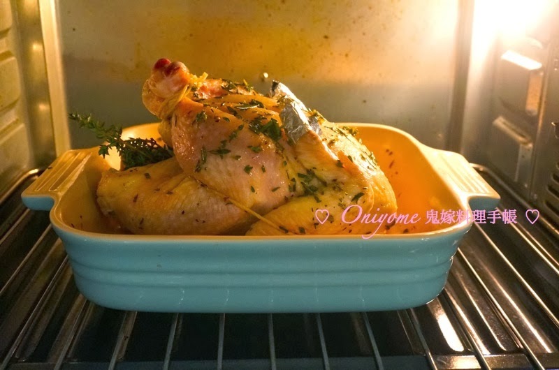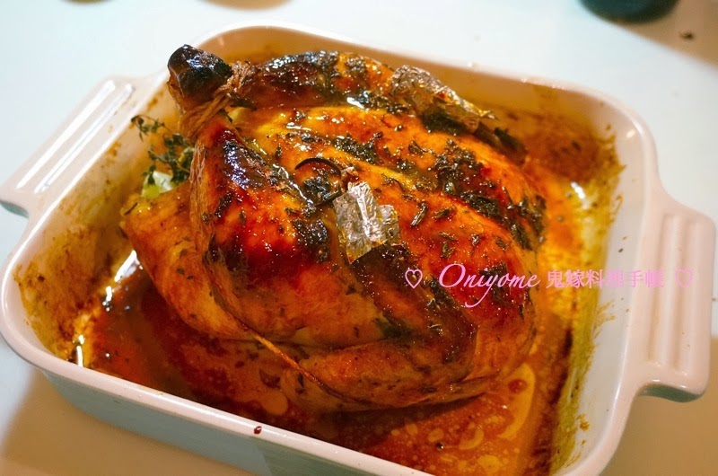 8) 中途開門3﹣4次,把留到焗盤上的雞汁塗到雞上,讓烤色更美,也令雞不會太乾,保持濕潤