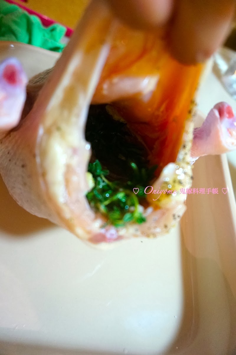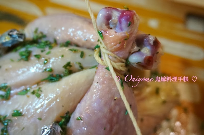 6) 交叉放好雞腿,再8字型打圈,縛好,打死結,剪去多餘的繩(當然不縛直接烤都可以啦)