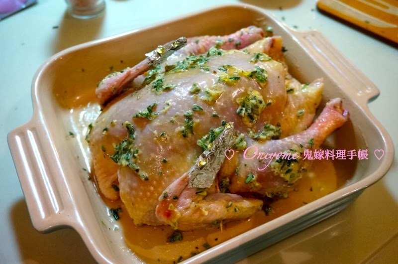 1) 雞洗淨內外,用廚房紙抹乾或掛乾,室溫放軟牛油, 預熱焗爐250度,