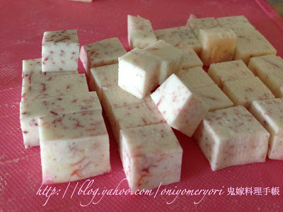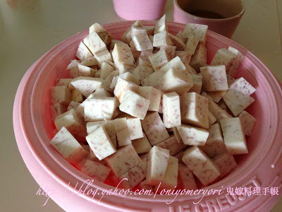 我最愛吃的是蘿蔔糕,其次是芋頭糕,以前在香港會買華麗園的來吃,相公不愛芋頭,我一個人獨吃,好爽!! 在曼谷沒有華麗園,想吃還是要自己動手,不過芋頭不易買,最後在超市找到不知放了多久的芋頭,樣子有點乾但想吃也買了。
