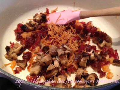 3) 平底鍋下1湯匙油,中火爆香臘腸、臘肉、 潤腸 、半份蝦米、冬菇和半份瑤柱,約8-10分鐘