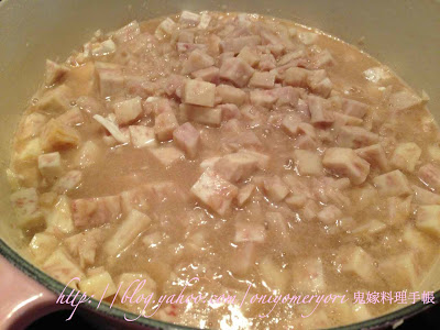 8) 開蓋,保持小火,加入(7)的粉漿和炒好的材料,一直拌勻至濃稠,像芝麻糊般,芋頭粒還在,約4-5分鐘