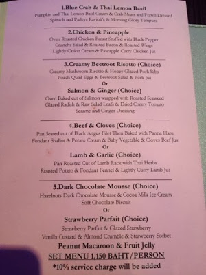 菜單只有一張紙,6 道菜 1150 baht + 10%, 約 hkd 300,物超所值! 2道前菜,2道主菜(各2選1)2道甜點(其中1道是2選1)每次都飽到第二天,連午餐也不想吃啊! 不要以為便宜便用料差,我覺得比很多貴價西餐都要好,主廚是在倫敦學藝的泰國人,幾年前回流曼谷開了這小店,年紀輕輕(好像剛滿30歲)卻非常有才華和創意,非常佩服他每星期轉菜單,設計新食譜,善用泰式時令材料製作西餐,當中的泰風味,清新而特別,他很會用香辛料,常常有劃龍點精的感覺! 百吃不厭是有點誇張,但每次吃都有驚喜,立即盤算幾時再吃,連店員都認得我們了~