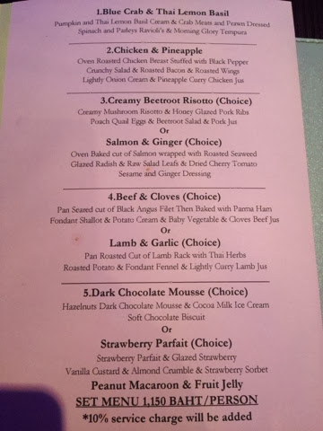 菜單只有一張紙,6 道菜 1150 baht + 10%, 約 hkd 300,物超所值! 2道前菜,2道主菜(各2選1)2道甜點(其中1道是2選1)每次都飽到第二天,連午餐也不想吃啊! 不要以為便宜便用料差,我覺得比很多貴價西餐都要好,主廚是在倫敦學藝的泰國人,幾年前回流曼谷開了這小店,年紀輕輕(好像剛滿30歲)卻非常有才華和創意,非常佩服他每星期轉菜單,設計新食譜,善用泰式時令材料製作西餐,當中的泰風味,清新而特別,他很會用香辛料,常常有劃龍點精的感覺! 百吃不厭是有點誇張,但每次吃都有驚喜,立即盤算幾時再吃,連店員都認得我們了~