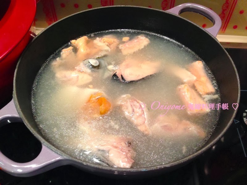 3) 再燒滾水,加入魚頭魚骨、 薑片和所有調味料,拌勻,滾起後轉小火,加蓋煮20分鐘