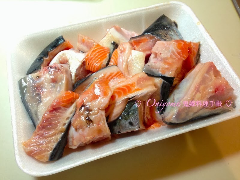 1) 三文魚頭洗淨,魚骨如有魚鱗,要去掉,或整片魚皮去掉,瀝乾水