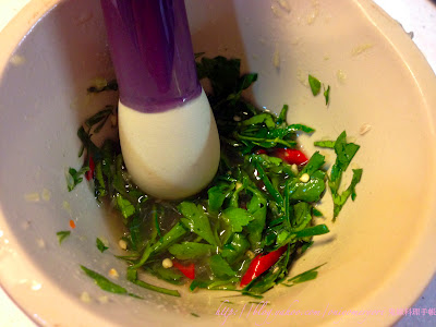 2) 泰式檸檬葉及指天椒切碎,混和青檸汁及其他沙律汁材料,略舂數下,讓材料出味