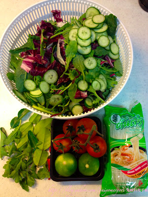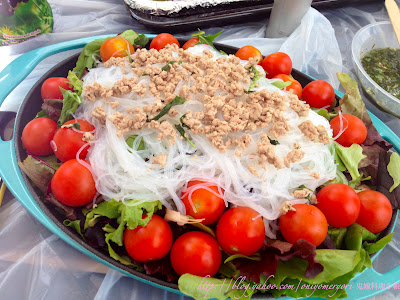 3) 碟上放沙律菜,然後粉絲及車厘茄,帶子放面, 淋上混和好的沙律汁