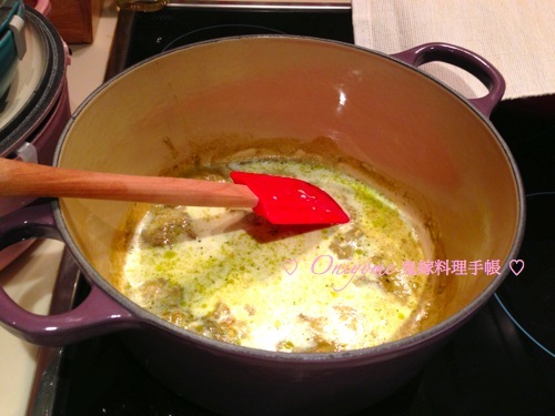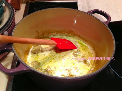 3) 下牛奶拌勻至奶醬溶合,約1.5分鐘