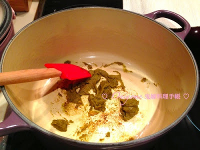 1)   鍋子下油,中火預熱30秒 ,下咖哩醬,中火炒約1分鐘艦