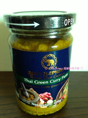 藍象的青咖哩醬包除了紙包裝,還有玻璃罐裝的,份量多很多, 除了煮青咖哩雞,還可以煮很多東西,