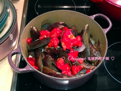 5) 下蕃茄炒勻,加魚露和糖,滾起加蓋轉小火煮5分鐘