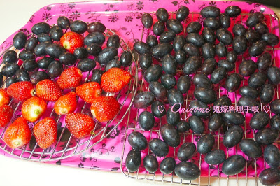 黑提和士多啤梨浸洗乾淨,我用了蔬菜清潔劑,浸了 30秒