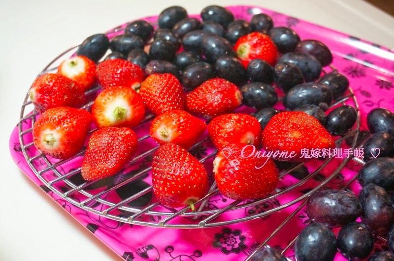 黑提和士多啤梨浸洗乾淨,我用了蔬菜清潔劑,浸了 30秒
