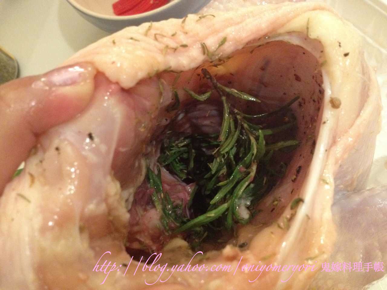 2) 雞胸內掃入1/2 湯匙鹽和牛油,加入4條迷迭香