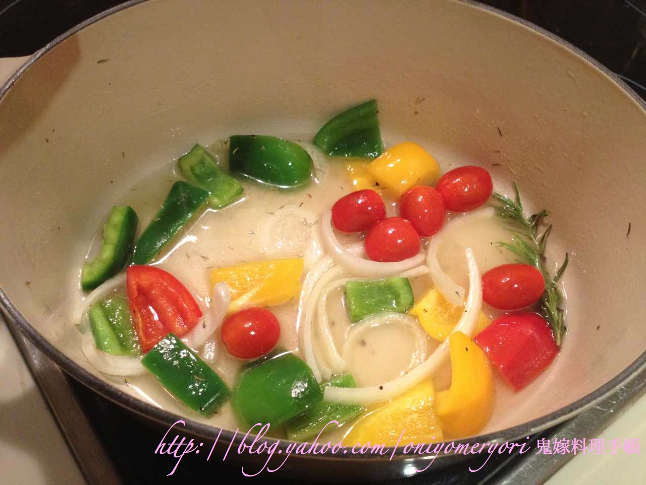 LC鍋或平底深鍋煮溶10g牛油,略煎蔬菜,約2分鐘,加1/4 茶匙鹽、少許胡椒拌勻,再煎2分鐘,加入白酒煮滾