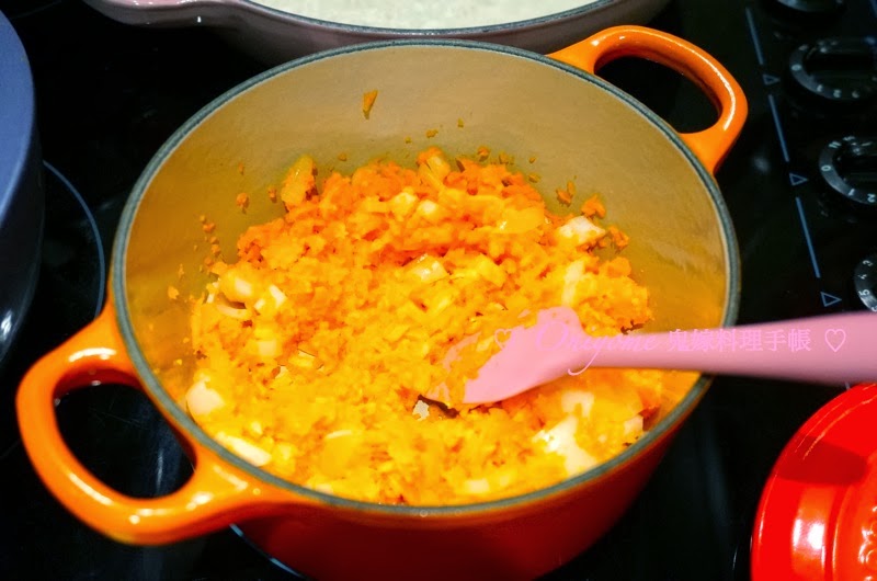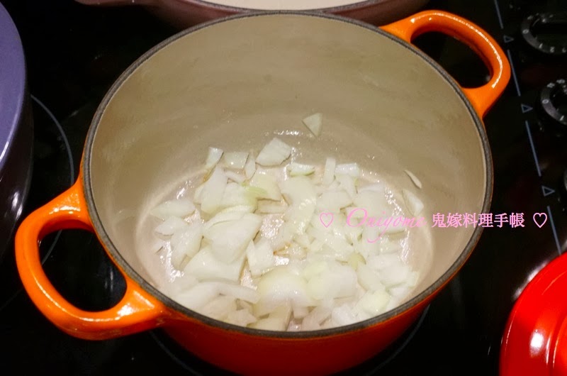 2) 鍋子下牛油,小火煮洋蔥10分鐘至透明變軟,甜味出來