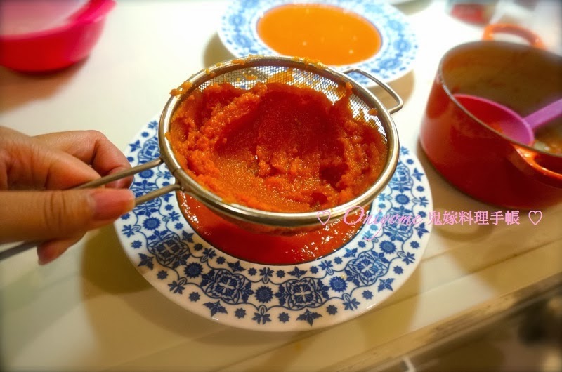 5) 倒回大鍋加蓋再用小火煮5分鐘,隔去渣, 加入少量鹽、胡椒和糖來調味