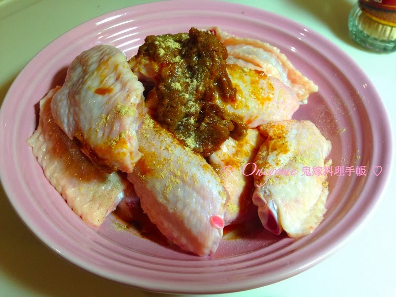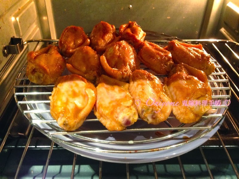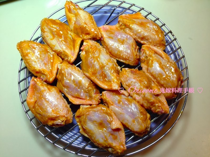 1)  雞翼洗淨吸乾水,以調味料醃30分鐘 ,按摩雞翼,令每一隻雞翼都能平均沾上醃料,預熱焗爐250度