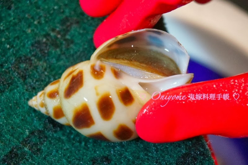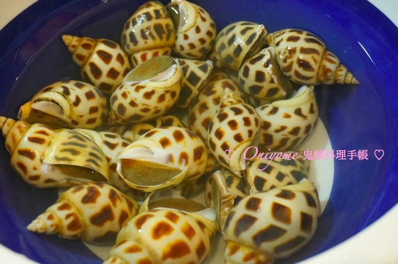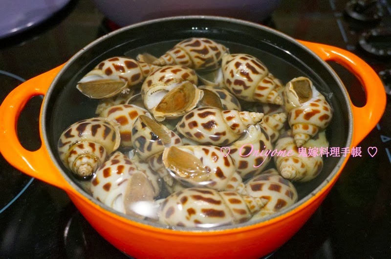 2) 燒滾一鍋水,花螺拖水約5分鐘,取出以清水沖洗