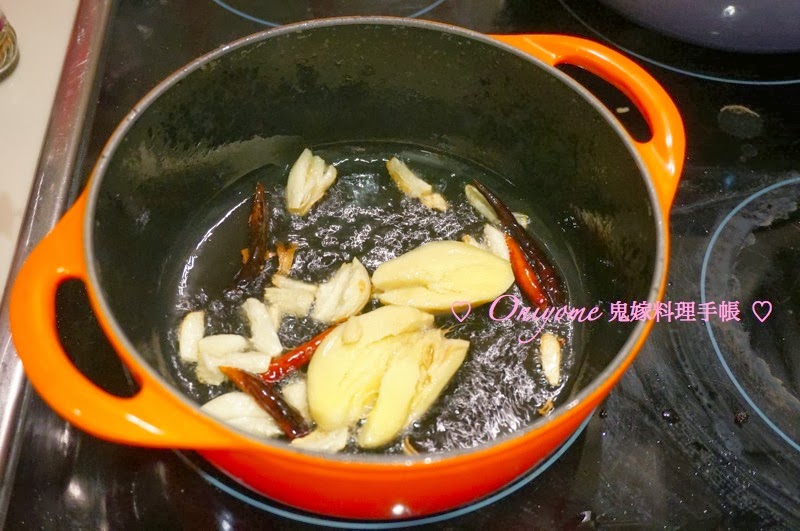 4)原鍋花椒油加入薑、蒜、乾辣椒,中火爆香,約1-2分鐘