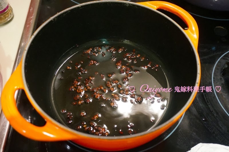 3) 鍋子加入3湯匙油及1湯匙花椒粒,煮至油滾,轉小火煮2分鐘,隔去花椒粒