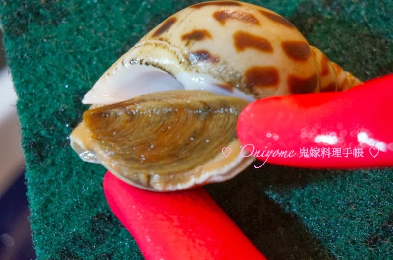 1) 洗淨花螺,以乾淨百潔布擦去外殼的“潺”,花螺買回來不用浸水,只要入雪櫃放好就可以了,煮前才浸水清洗