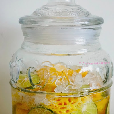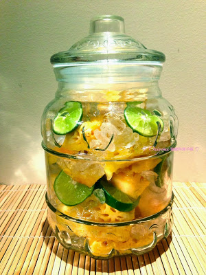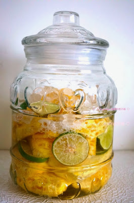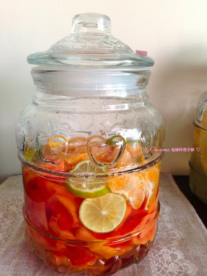 所有材料分成3等份,1份生果放最下面,再放青檸(檸檬),最後放冰糖,然後重覆,最面放冰糖, 總之就是一層一層的放,不用很工整,隨意就可以了,最重要是面層一定是冰糖,