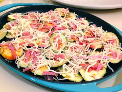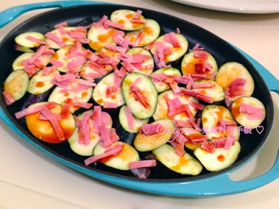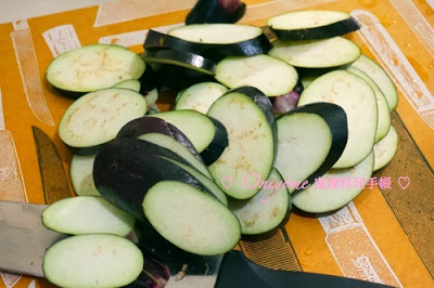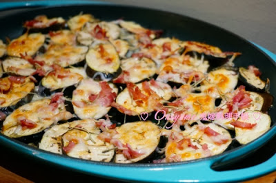 1)茄子斜斜的切片,加2湯匙燒汁拌勻,平排在焗盤上,預熱焗爐 250度