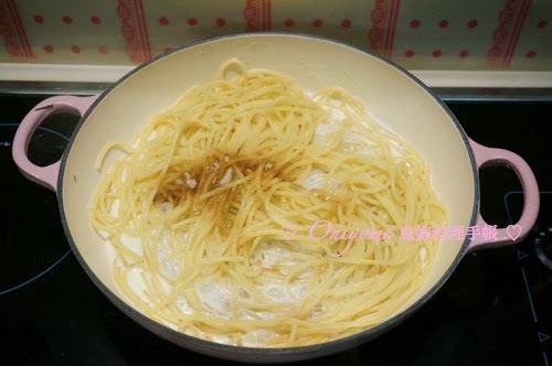 1)鍋子燒滾熱水,加1湯匙鹽, 意大利粉按包裝指示分鐘少3分鐘來煮, 撈起瀝乾水份備用,這是我愛用的意大利粉,比百德阿E的好吃,我愛Al Dente,所以煮了7分鐘(10﹣ 3)