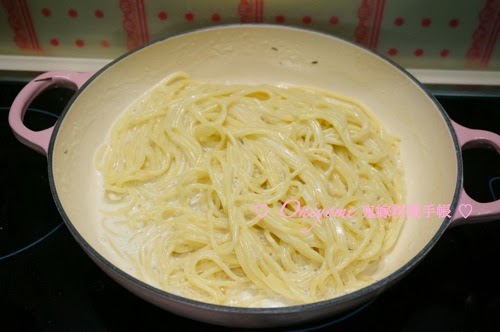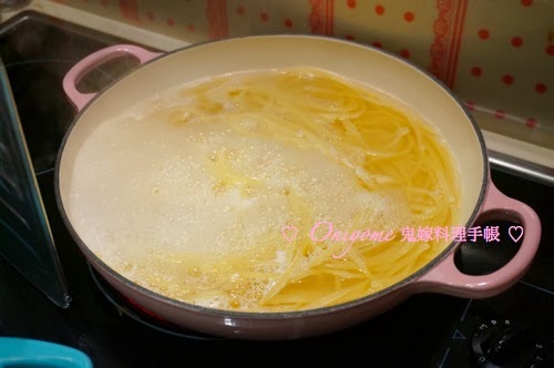 3) 鍋子加入忌廉和牛奶,中火煮滾,加入意粉和鰹魚粉拌勻