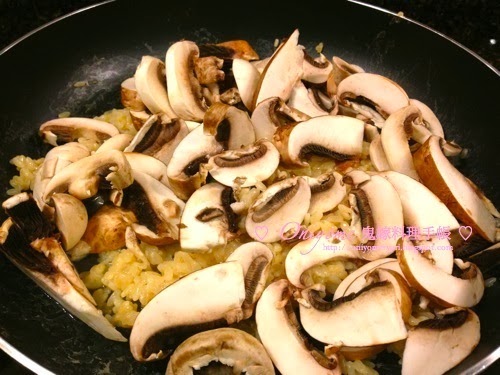 4)加入雜菌拌勻,加蓋,轉中火煮1分鐘,再轉小火煮5分鐘(這是 Ad Dente 的口感)
