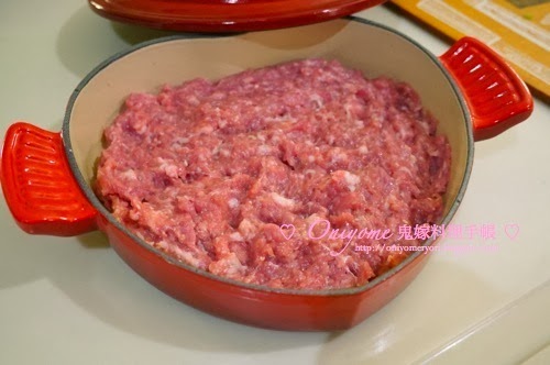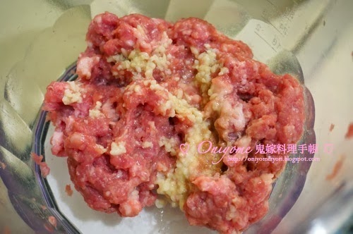 1) 肉餅混和所有調味,以筷子順一個方攪勻(約十多次),肉餅再放入三層即棄保鮮袋,向檯面“撻”幾十次,約5分鐘(自己絞肉餅,比較清潔衛生)