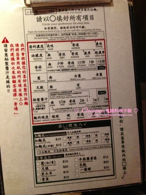快到門口時,先點菜,麵只有一款,但可選不同濃淡軟硬口味,蔥和叉的有無,我愛4倍秘製辣醬、青蔥和超硬麵