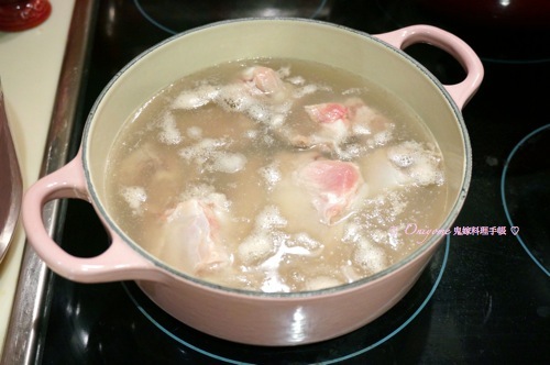 1) 凍水落豬肋骨 ,中小火至水滾取出豬肋骨,以水洗淨(此為跑活水,凍水落肉更能迫出雜質,連會引至尿酸過高的 Purine 也會迫出,比滾水飛水/出水更健康,滾水的話,蛋白質遇熱凝固,雜質反而被封在肉內,看到浮面的污物0麻)